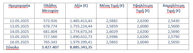 Σύμφωνα με σχετική ανακοίνωση, η «Eurobank Ergasias Υπηρεσιών και Συμμετοχών Ανώνυμη Εταιρεία» («Eurobank Holdings»), σε συνέχεια της από 07.05.2025 ανακοίνωσής της σχετικά με την έναρξη εφαρμογής του Προγράμματος Επαναγοράς Ιδίων Μετοχών («Πρόγραμμα»), που εγκρίθηκε με την απόφαση της Τακτικής Γενικής Συνέλευσης των Μετόχων της Eurobank Holdings στις 30.04.2025 και σε συνέχεια της από 30.04.2025 απόφασης του Διοικητικού Συμβουλίου της, ενημερώνει το κοινό ότι κατά το διάστημα 12/5/2025 – 16/05/2025 απέκτησε συνολικά, στο πλαίσιο του Προγράμματος, 3.427.407 μετοχές εκδόσεως της ιδίας («Ίδιες Μετοχές») που διαπραγματεύονται στο Χρηματιστήριο Αθηνών («Χ,Α,»), με μέση τιμή κτήσης €2,5924, ανά μετοχή και συνολικό κόστος €8.885.343,35.