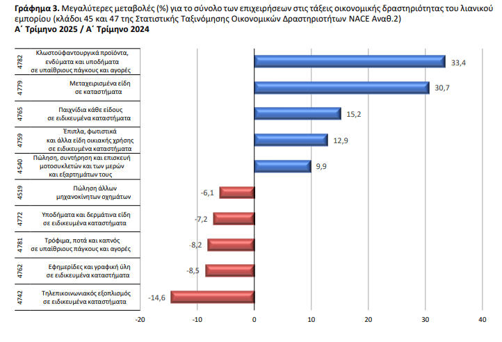 Για το σύνολο των επιχειρήσεων του τομέα λιανικού εμπορίου, οι δραστηριότητες που παρουσίασαν τη μεγαλύτερη αύξηση στον κύκλο εργασιών το πρώτο τρίμηνο του 2025 σε σχέση με το αντίστοιχο τρίμηνο του 2024 είναι: