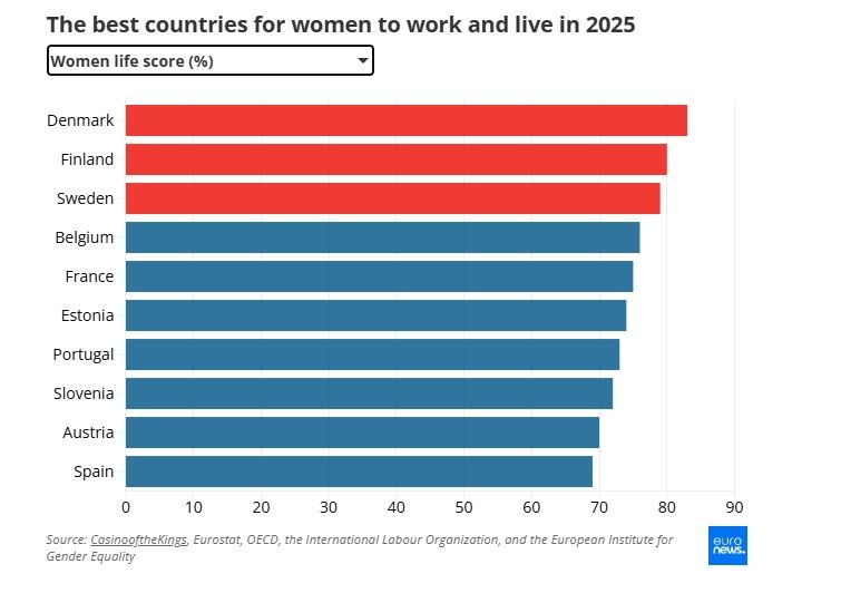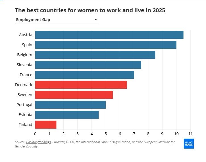 Δανία, Φινλανδία, Σουηδία περιλαμβάνονται στο τοπ 3 της λίστας των ευρωπαϊκών χωρών για να εργαστούν και να ζήσουν οι γυναίκες, ενώ δύο χώρες της Νότιας Ευρώπης βρίσκονται στις τελευταίες θέσεις.