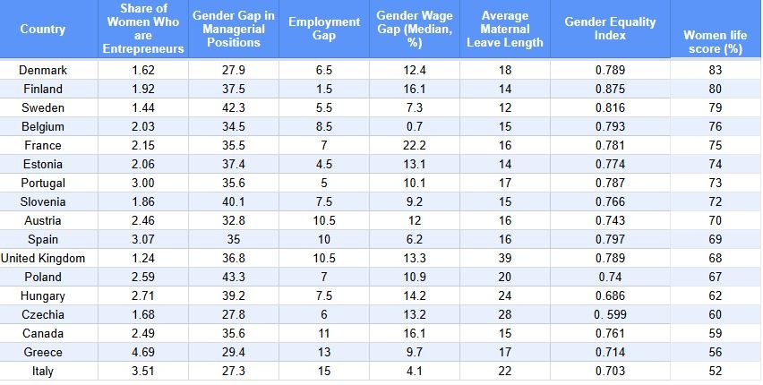 Η Δανία βρίσκεται στην κορυφής λίστας, με βαθμολογία ζωής 83, αντανακλώντας μικρότερα χάσματα στην απασχόληση και υψηλή ισότητα των φύλων.