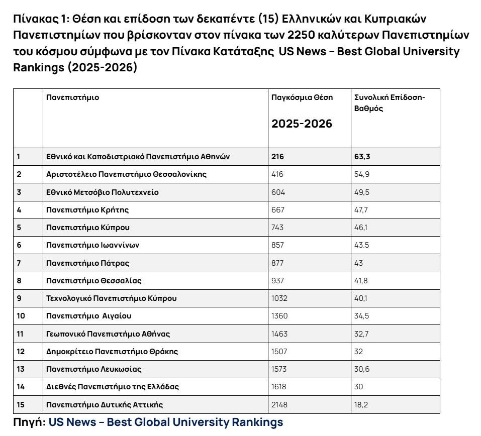 «Με ιδιαίτερη υπερηφάνεια δεχτήκαμε τα νέα από τις διεθνώς αναγνωρισμένες κατατάξεις US News Global University Ranking 2025-2026 και Times Higher Education Impact Rankings, καθώς το Εθνικό και Καποδιστριακό Πανεπιστήμιο Αθηνών κατατάσσεται για το 2025 στην 1η θέση μεταξύ των Πανεπιστημίων σε Ελλάδα και Κύπρο και στην 216η θέση παγκοσμίως, συνεχίζοντας την ανοδική του πορεία.