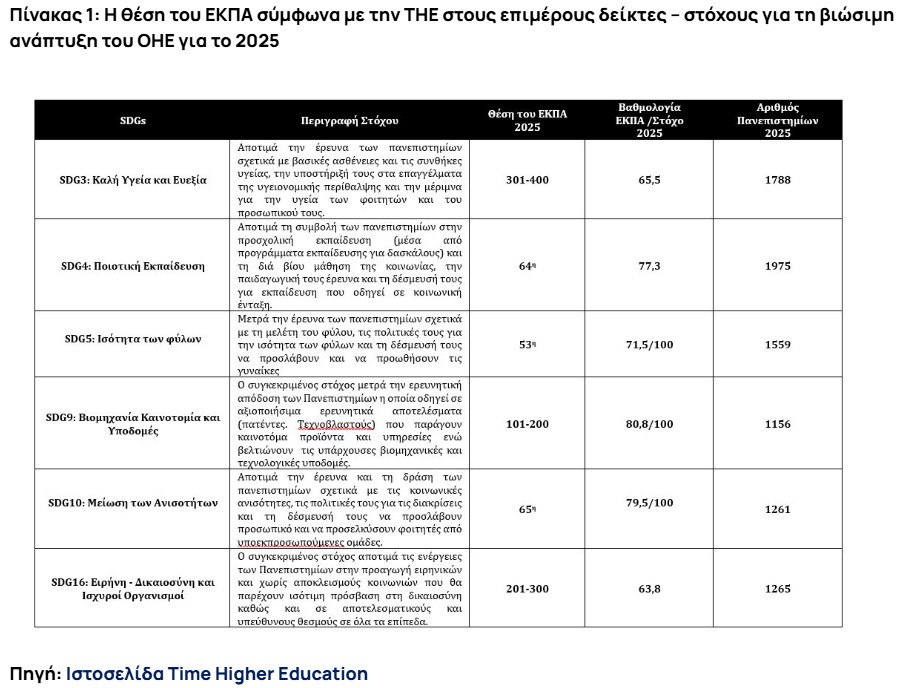 Παράλληλα θα πρέπει να επισημανθεί ότι η συγκεκριμένη κατάταξη δεν στηρίζεται σε βιβλιομετρικούς δείκτες έρευνας και στη μέτρηση ετεροαναφορών. Αποδεικνύεται συνεπώς ότι το Πανεπιστήμιο μας εφαρμόζει ορθές και αποτελεσματικές πολιτικές που συμβάλλουν σε μια βιώσιμη και δίκαιη ανάπτυξη με συνεχή προσπάθεια μείωσης των ανισοτήτων, ενίσχυση της θέσης της γυναίκας στη διοίκηση και τις σπουδές, βελτίωση της υγείας των συνανθρώπων μας, παροχή ποιοτικής δημόσιας εκπαίδευσης σε όλες τις βαθμίδες και σε όλο τον ελληνικό και όχι μόνο πληθυσμό.