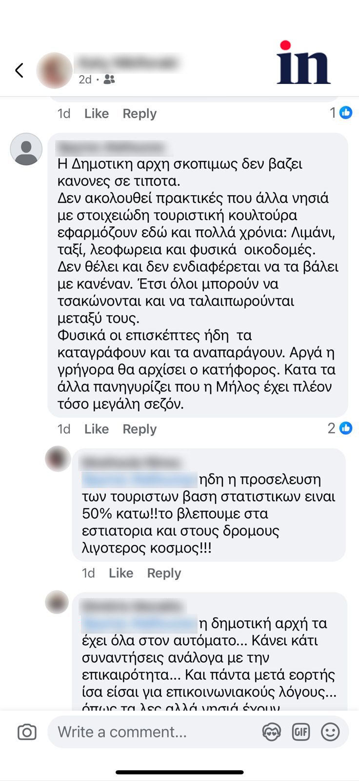 Σοβαρές είναι οι ανησυχίες και για τις επιπτώσεις στον τουρισμό, αφού σύμφωνα με τα όσα αναφέρουν οι κάτοικοι στις συνομιλίες τους, που είναι στη διάθεση του in, οι επισκέπτες ήδη καταγράφουν και αναπαράγουν τα όσα συμβαίνουν και «αργά ή γρήγορα θα αρχίσει ο κατήφορος».