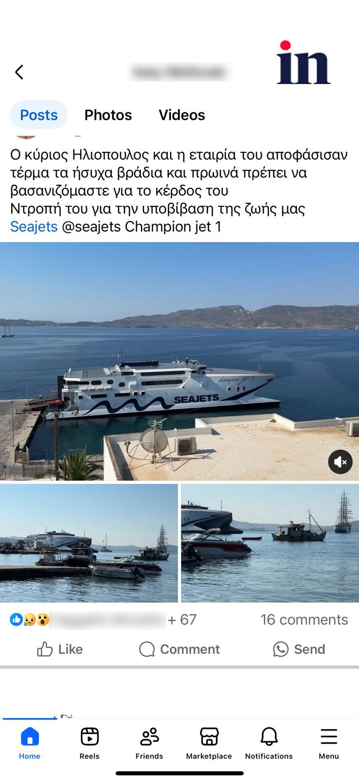 Σε μηνύματα που ανταλλάσσουν μεταξύ τους οι κάτοικοι του Αδάμαντα στα μέσα κοινωνικής δικτύωσης καταγγέλλουν την εταιρεία του Μάριου Ηλιόπουλου SeaJets ότι έχει αποφασίσει να βάλει τέλος στα «ήσυχα βράδια και πρωινά» επιλέγοντας να βασανίζει όσους διαμένουν στην περιοχή «για το κέρδος».