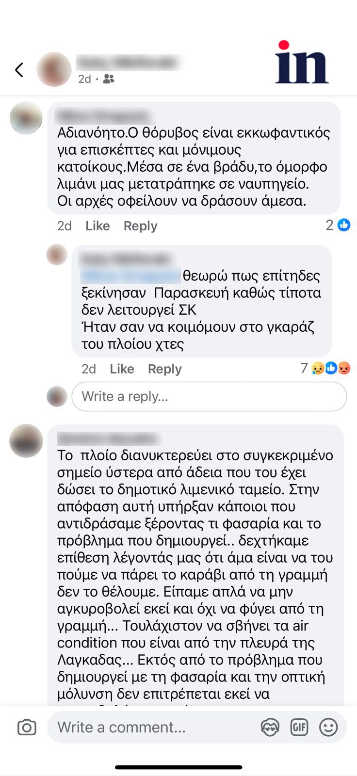 Για αδιανόητη κατάσταση, και θόρυβο εκκωφαντικό, που μετατρέπει το λιμάνι σε «ναυπηγείο» καλώντας «τις αρχές να δράσουν άμεσα» κάνει λόγο άλλος κάτοικος.