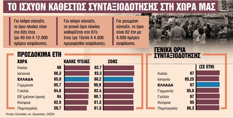 Σύμφωνα με τον ΟΟΣΑ, η χώρα μας εμφανίζει από τα χαμηλότερα όρια ηλικίας εξόδου από την εργασία στην Ευρώπη, με μέσο όρο κάτω των 60 ετών για τις γυναίκες και μόλις 63,2 για τους άνδρες – χαμηλότερα μόνο το Λουξεμβούργο.