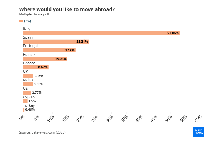 Ο δημοφιλέστερος προορισμός είναι η Ιταλία με ένα ποσοστό 53,06%. Η Ισπανία είναι η δεύτερη επιλογή με 22%, ακολουθούμενη από την Πορτογαλία (18%), τη Γαλλία (15%), την Ελλάδα (9%), το Ηνωμένο Βασίλειο (3%) και τη Μάλτα (3%), σύμφωνα με το portal ακινήτων gate-away.com που επικαλείται το Euronews.