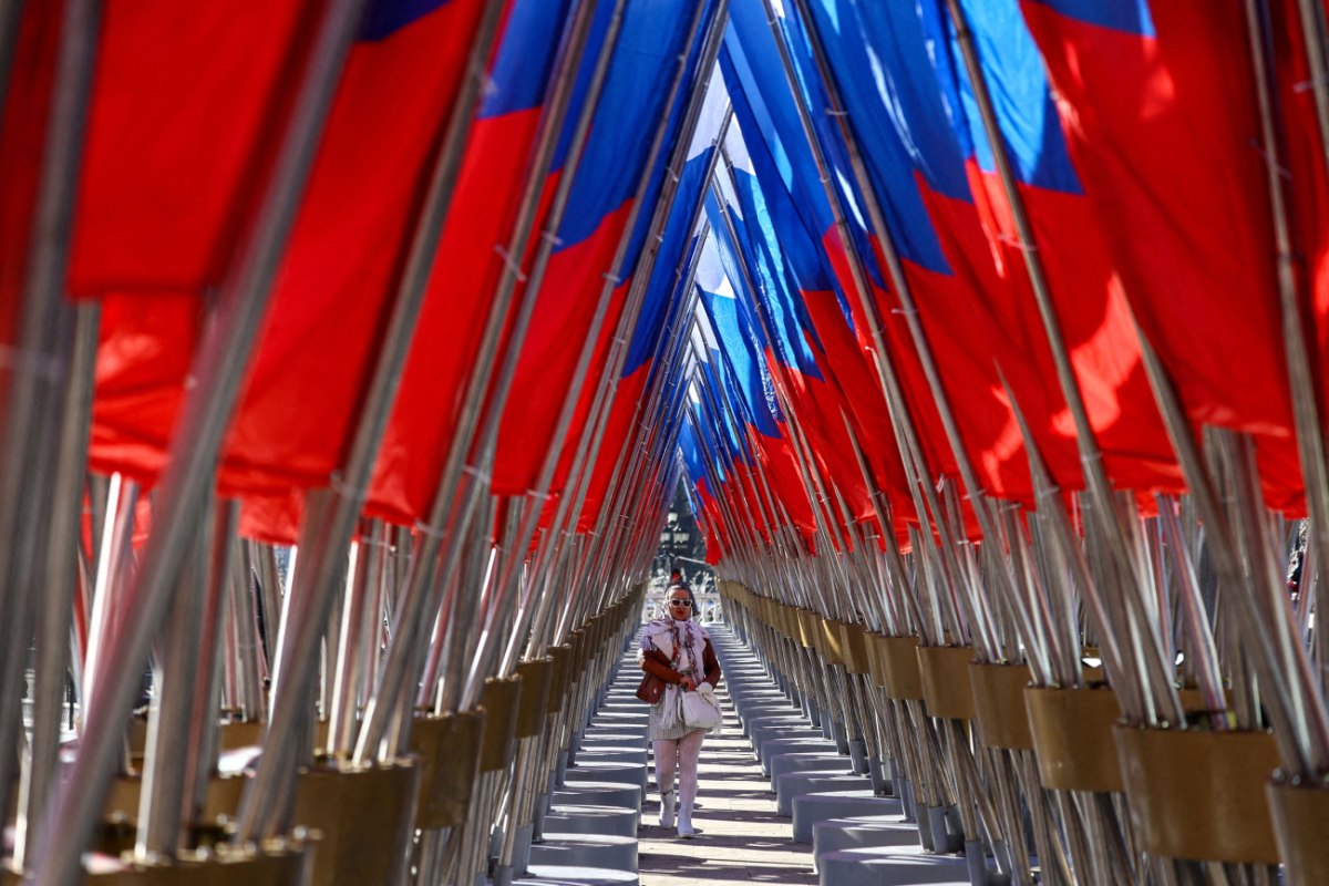 Μια γυναίκα περπατά ανάμεσα σε ρωσικές σημαίες στο κέντρο της Μόσχας (REUTERS/Evgenia Novozhenina/File Photo)