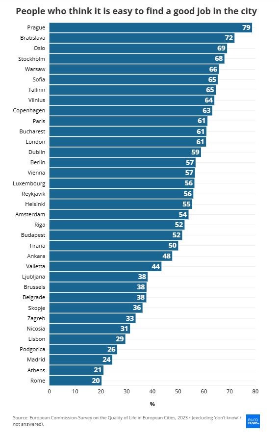 Η Αθήνα είναι η δεύτερη χειρότερη πρωτεύουσα στην Ευρώπη για εύρεση ποιοτικής εργασίας / πηγή: Eυρωπαϊκή Επιτροπή – επεξεργασία Εuronews