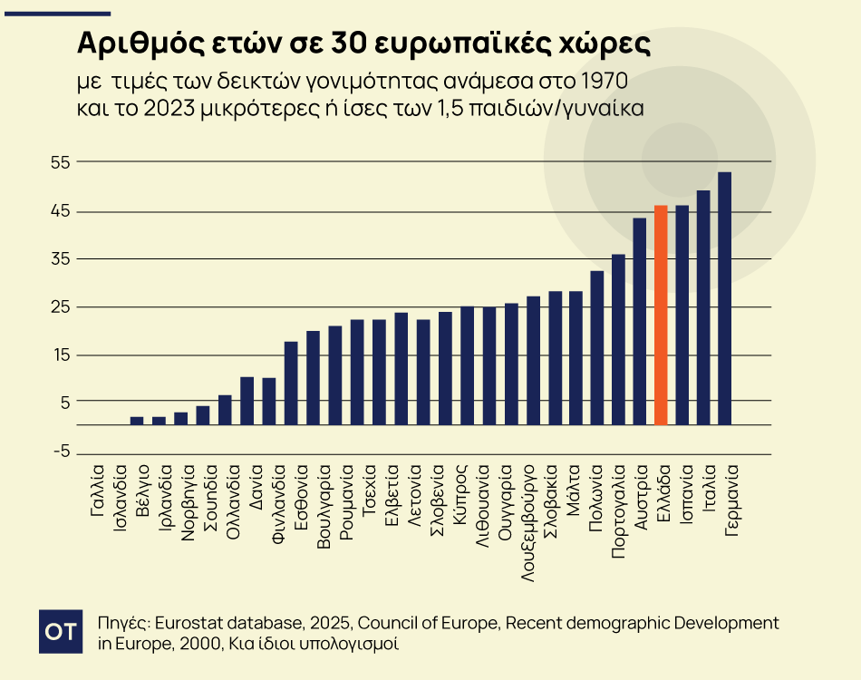 Από τη ανάλυση των δεδομένων (Γράφημα 1) προκύπτει ότι μια σχεδόν στις τρεις χώρες (σε 10 από τις 30) είτε οι ετήσιοι δείκτες δεν έπεσαν ποτέ κάτω από τα 1,5 παιδιά/γυναίκα (Γαλλία και Ισλανδία), είτε, όπως στο Βέλγιο, Ιρλανδία, Νορβηγία, Σουηδία, Ολλανδία, Δανία και Φιλανδία και Εσθονία ο αριθμός των ετών όπου καταγράφονται τόσο χαμηλές τιμές ήταν εξαιρετικά περιορισμένος (λιγότερα από 15 από τα 54 εξεταζόμενα έτη). Στο άλλο άκρο όμως πέντε χώρες (Αυστρία, Ελλάδα, Ισπανία, Ιταλία και Γερμανία) χαρακτηρίζονται από πολύ χαμηλούς ετήσιους δείκτες για πάρα πολλά χρόνια (35 ή και περισσότερα από τα 54 εξεταζόμενα).