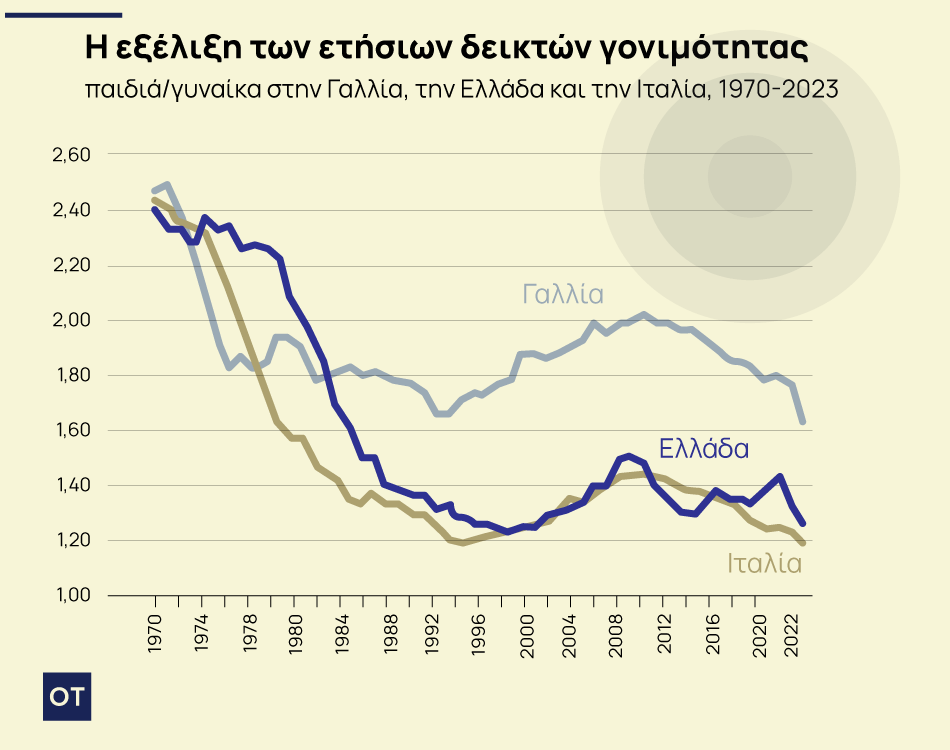 Δεν είναι ακόμη τυχαίο ότι οι χώρες στις οποίες καταγράφονται πολύ χαμηλές τιμές δεικτών για 35 ή και περισσότερα ακόμη χρόνια είναι συνήθως χώρες όπως π.χ η Ελλάδα ή ακόμη η Ιταλία (Γράφημα 2) που δεν έλαβαν υπόψη τις αλλαγές που αναφέραμε και δεν υιοθέτησαν έγκαιρα αντίστοιχα μέτρα και πολιτικές με αποτέλεσμα οι ετήσιοι δείκτες τους να κινούνται επι μακρόν ανάμεσα στα 1,2 και 1,5 παιδιά, γεγονός που αποτυπώνεται και στην ταχεία μείωση στις χώρες αυτές όχι μόνον των γεννήσεων αλλά και του αριθμού των παιδιών ανάμεσα στις γυναίκες που γεννήθηκαν στις αρχές της δεκαετίας του’50 και σε αυτές που γεννήθηκαν τρεις δεκαετίες αργότερα (βλ. και FOCUS 6, 2025, «Ο αριθμός παιδιών που έκαναν οι γενεές που γεννηθήκαν στις αρχές του 1950 και του 1980 στις Ευρωπαϊκές χώρες: πτωτική πορεία αλλά με εξαιρετικά διαφοροποιημένους ρυθμούς»