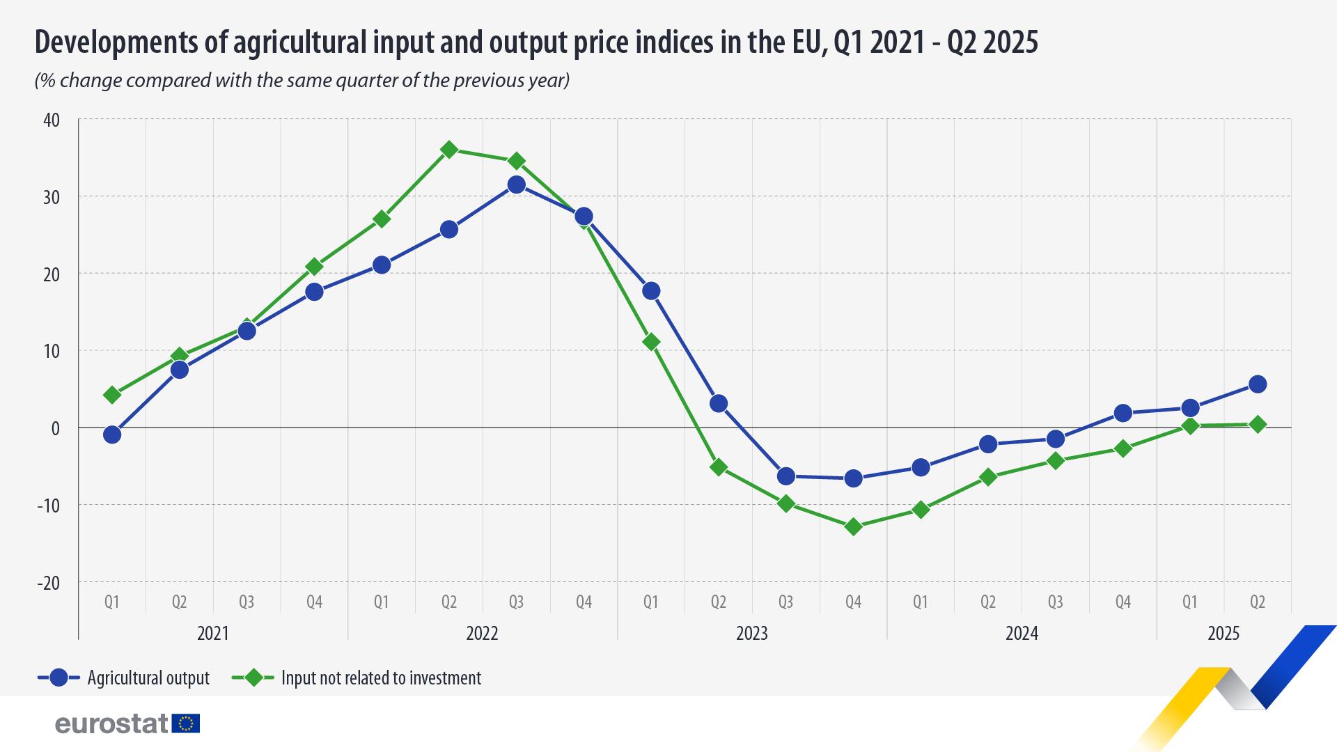 Επίσης, η μέση τιμή των αγαθών και των υπηρεσιών που χρησιμοποιούνται στη γεωργία και δεν σχετίζονται με επενδύσεις – όπως η ενέργεια, τα λιπάσματα ή οι ζωοτροφές – αυξήθηκε ελαφρώς (0,4%) μεταξύ του δεύτερου τριμήνου του 2024 και του δεύτερου τριμήνου του 2025.