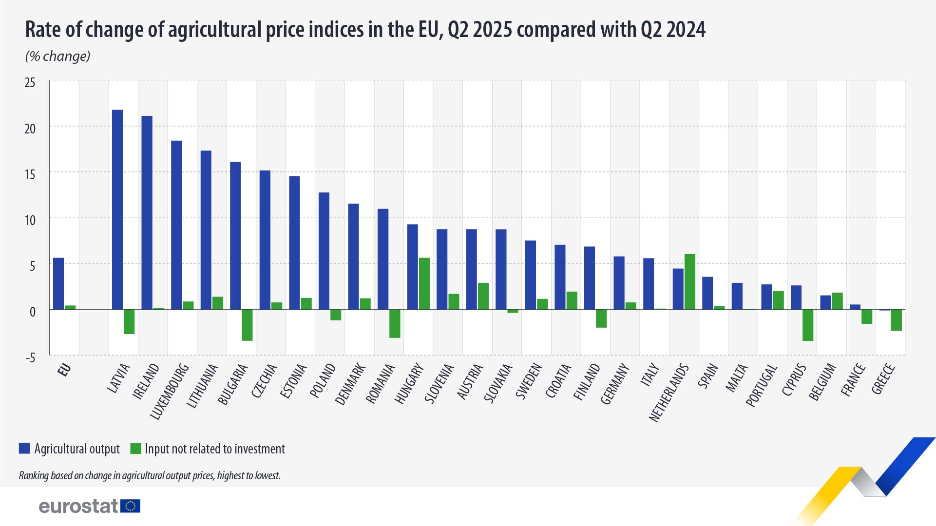 Αυξημένη κατά 5,6% ήταν η μέση τιμή των αγροτικών προϊόντων στην ΕΕ το δεύτερο τρίμηνο του 2025, σε σύγκριση με την αντίστοιχη περίοδο του 2024. Οι τιμές, σύμφωνα με τα στοιχεία της Eurostat, ήταν υψηλότερες σε κάθε χώρα της ΕΕ, εκτός από την Ελλάδα.