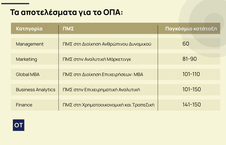Νέα διεθνής αναγνώριση για το Οικονομικό Πανεπιστήμιο Αθηνών (ΟΠΑ), καθώς τα Προγράμματα Μεταπτυχιακών Σπουδών (ΠΜΣ) του συγκαταλέγονται στα κορυφαία παγκοσμίως για το 2026, σύμφωνα με την έγκυρη κατάταξη “QS Global MBA & Business Masters Rankings” της Quacquarelli Symonds (QS).