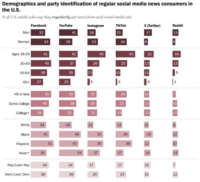 Όπως υποστηρίζει το Pew Research Center, οι νεότεροι άνθρωποι είναι πιο πιθανό να είναι τακτικοί θεατές ειδήσεων στο TikTok, το Instagram, το Reddit και το X. Οι Αφροαμερικανοί, οι Ισπανόφωνοι και οι Ασιάτες Αμερικανοί είναι πιο πιθανό από τους λευκούς Αμερικανούς να λαμβάνουν τακτικά ειδήσεις από το YouTube, το Instagram και το WhatsApp. Επιπλέον, όσοι δεν έχουν πτυχίο πανεπιστημίου είναι πιο πιθανό από όσους έχουν πτυχίο πανεπιστημίου να λαμβάνουν ειδήσεις από το Facebook και το TikTok.