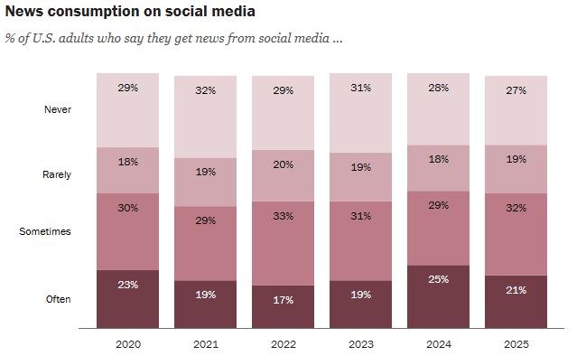 Συνολικά, περίπου οι μισοί ενήλικες στις ΗΠΑ (53%) δηλώνουν ότι αρκετά συχνά ενημερώνονται από τα social media, ποσοστό που παραμένει σταθερό τα τελευταία χρόνια.