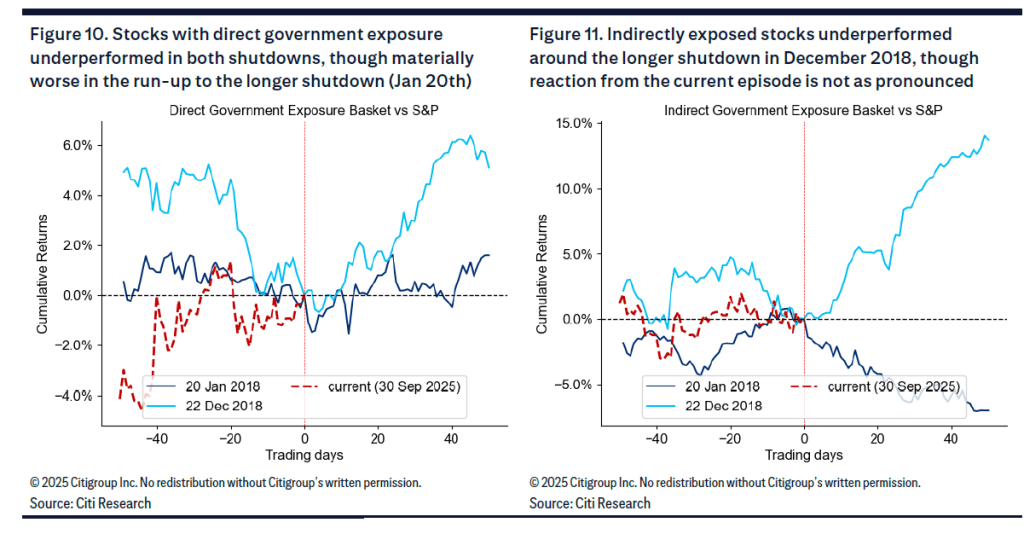 Στην ανάλυση της Citigroup, τα shutdown της κυβέρνησης χωρίζονται σε «βραχυπρόθεσμα» (διαρκούν λιγότερο από πέντε ημέρες) και «μακροπρόθεσμα» (διαρκούν τουλάχιστον πέντε ημέρες). Όπως καταδεικνύεται από τα δεδομένα, οι μετοχές τείνουν να εξασθενούν ενόψει μιας αναστολής, ενώ τα ομόλογα συνήθως παραμένουν ανθεκτικά, με τις μεγαλύτερες αναστολές να δείχνουν μια πιο διακριτή διάκριση μεταξύ των δύο.