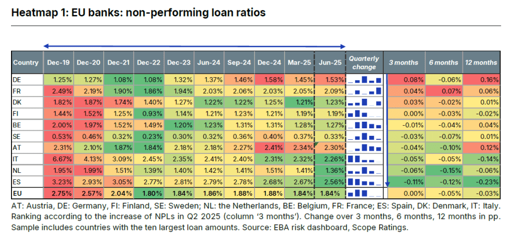 Σταθερή στην εκτίμηση ότι θα υπάρξει σταδιακά μέτρια επιδείνωση της ποιότητας των περιουσιακών στοιχείων των ευρωπαϊκών τραπεζών παραμένει η Scope, υποδεικνύοντας ότι οι δείκτες των μη εξυπηρετούμενων εταιρικών δανείων (NPLs) παραμένουν υψηλά στην Ευρωπαϊκή Ένωση, ιδιαίτερα στη Γερμανία, τη Γαλλία, την Αυστρία και το Βέλγιο, ενώ οι γεωπολιτικοί κίνδυνοι και οι εμπορικές εντάσεις έχουν δημιουργήσει αβεβαιότητα για την οικονομική προοπτική.