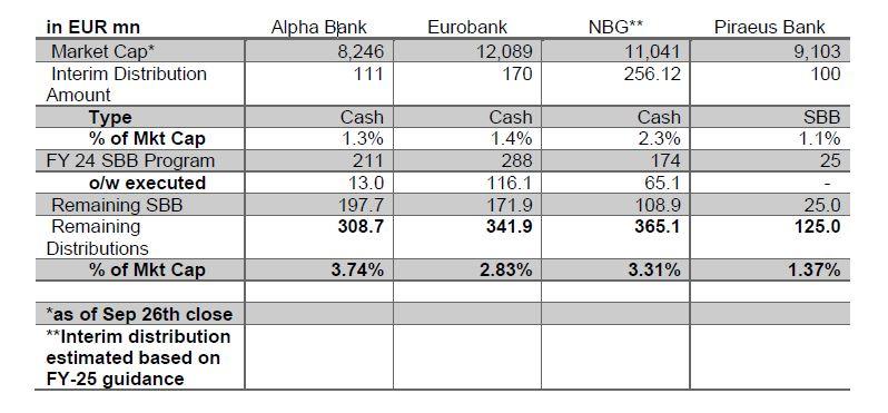Το πρόγραμμα επαναγοράς ιδίων μετοχών ξεκίνησε στις 17 Σεπτεμβρίου και αφορά 170.000.000 μετοχές, και θα ολοκληρωθεί τους επόμενους 15 μήνες. Παράλληλα, η Τράπεζα έχει ανακοινώσει τη διανομή προμερίσματος ύψους 111 εκατ. ευρώ το Δεκέμβριο του τρέχοντος έτους και αφορά το πρώτο μέρος από το 50% επί των συνολικών κερδών του 2025.