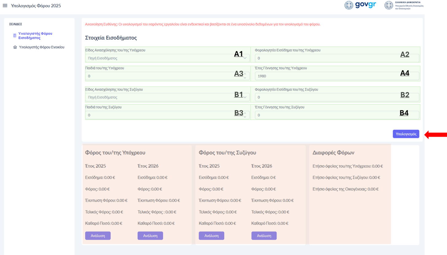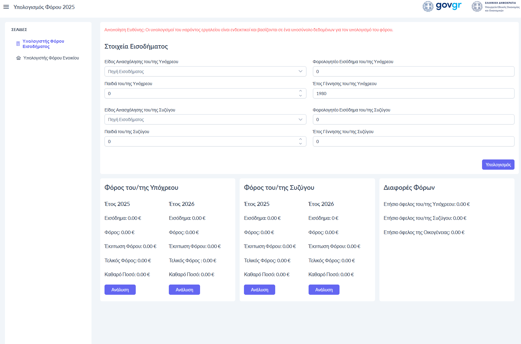 Κάθε πολίτης μπορεί να επιλέξει τον Υπολογιστή Φόρου Εισοδήματος που εμφανίζεται στην αρχική οθόνη ή τον Υπολογιστή Φόρου Ενοικίου.