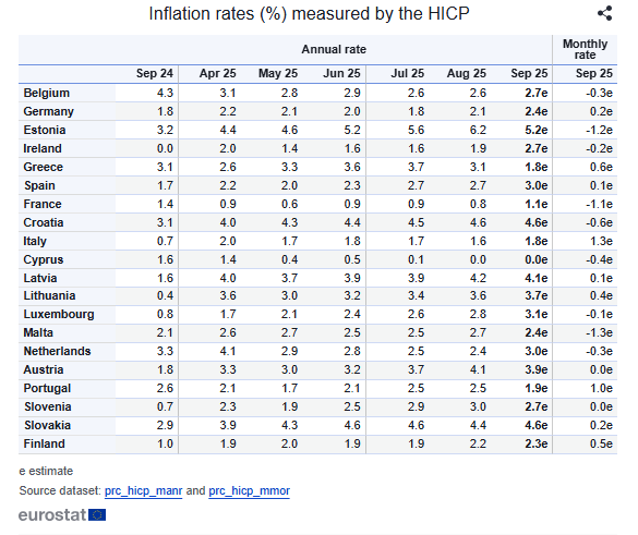Τα στοιχεία της Γαλλίας έδειξαν πληθωρισμό στις υπηρεσίες στο 2,4% τον Σεπτέμβριο από 2,1% τον Αύγουστο, καθώς οι αυξήσεις στις τιμές της υγειονομικής περίθαλψης επιταχύνθηκαν και το κόστος των τηλεπικοινωνιών υποχώρησε λιγότερο σε σχέση με τους προηγούμενους μήνες. Οι τιμές της ενέργειας επίσης μειώθηκαν λιγότερο λόγω των συγκριτικών επιδράσεων, καθώς τον Σεπτέμβριο του 2024 είχαν καταγραφεί έντονες πτώσεις στα πετρελαϊκά προϊόντα.