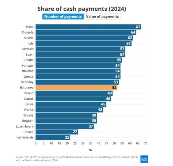 Τα μετρητά αποτελούν το 45% έως 55% των συναλλαγών περίπου στις μισές από τις χώρες της Ζώνης του Ευρώ. Η χρήση μετρητών κυμαίνεται από μόλις 22% στην Ολλανδία έως 67% στη Μάλτα που βρίσκεται στην κορυφή, ενώ η Ελλάδα κατατάσσεται λίγο πάνω από τον μέσο όρο (54%).