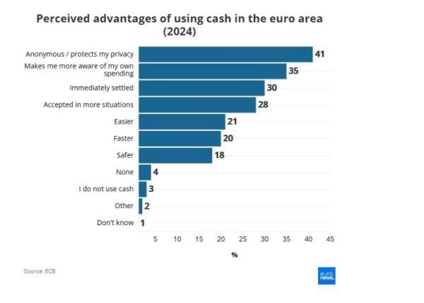 Τα παραπάνω στοιχεία αφορούν έρευνα της ΕΚΤ σε δείγμα 40.000 συμμετεχόντων. Όπως αναφέρει το Euronews, τα βασικά πλεονεκτήματα που επικαλούνται οι καταναλωτές υπέρ των μετρητών είναι η ανωνυμία και η προστασία της ιδιωτικότητας (41%), η καλύτερη διαχείριση των εξόδων (35%) και η άμεση ολοκλήρωση της συναλλαγής (30%).