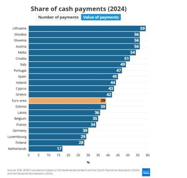 Αν και η χρήση των μετρητών βρίσκεται σε πτώση στη Γηραιά Ήπειρο, καθώς όλο και περισσότεροι Ευρωπαίοι στρέφονται στις ψηφιακές πληρωμές, το χρήμα σε φυσική μορφή κυριαρχεί στις συναλλαγές (52% ο μέσος όρος στην Ευρωζώνη για το 2024). Ωστόσο, το ποσοστό είναι σημαντικά χαμηλότερο (39%) όταν εξετάζεται σε όρους αξίας κάθε πληρωμής.