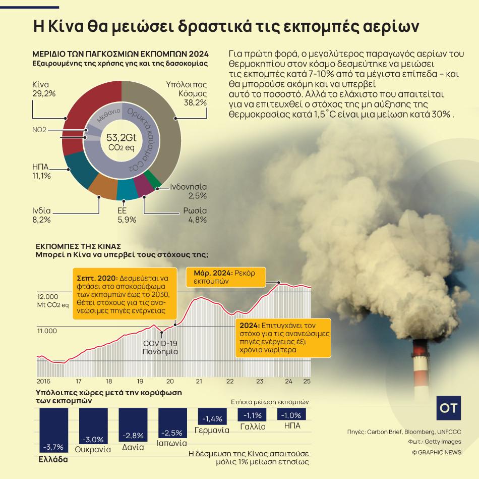 Η Κίνα ο μεγαλύτερος -με διαφορά- ρυπαντής του κόσμου υπόσχεται να μειώσει δραστικά τις εκπομπές αερίων του θερμοκηπίου. Το Πεκίνο δεσμεύτηκε για πρώτη φορά να μειώσει τις εκπομπές κατα 7 έως 10% απο τα μέγιστα επίπεδα που σημειώθηκαν το Μάρτιο του 2024 (12.000 μετρικοί τόνοι διοξειδίου του άνθρακα) αν και θα αρκούσε η πιστή τήρηση και κατάκτηση μικρότερων ποσοστών.