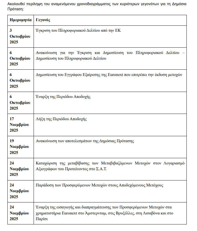 Με βάση το χρονοδιάγραμμα, στις 19 Νοεμβρίου θα ανακοινωθούν τα αποτελέσματα της Δημόσιας Πρότασης και στις 24 του ίδιου μήνα αναμένεται η έναρξη της εισαγωγής και διαπραγμάτευσης των Προσφερόμενων Μετοχών στα χρηματιστήρια Euronext στο Άμστερνταμ, στις Βρυξέλλες, στη Λισαβόνα και στο Παρίσι.