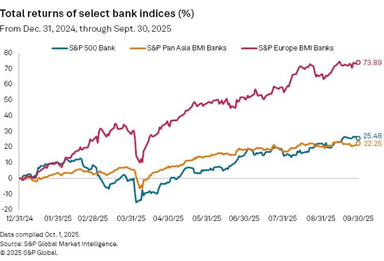 Ο δείκτης S&P Europe BMI Banks σημείωσε άνοδο 14,71% στο τρίμηνο, ενώ από την αρχή του έτους έχει αυξηθεί κατά 73,89%. Σε σύγκριση, ο δείκτης S&P 500 Bank των ΗΠΑ παρουσίασε αύξηση 25,48%, και ο S&P Pan Asia BMI Banks ενισχύθηκε κατά 22,25%.