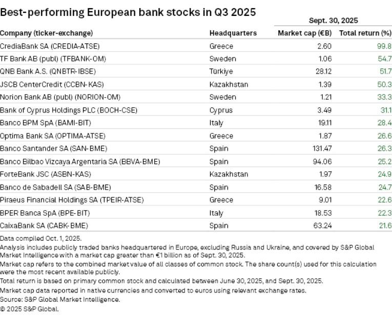 Σε γενικές γραμμές, οι ευρωπαϊκές τράπεζες συνέχισαν την ανοδική τους πορεία στο χρηματιστήριο κατά το τρίτο τρίμηνο του 2025, ξεπερνώντας τις αντίστοιχες αμερικανικές και ασιατικές τράπεζες, σύμφωνα με στοιχεία της S&P Global Market Intelligence.