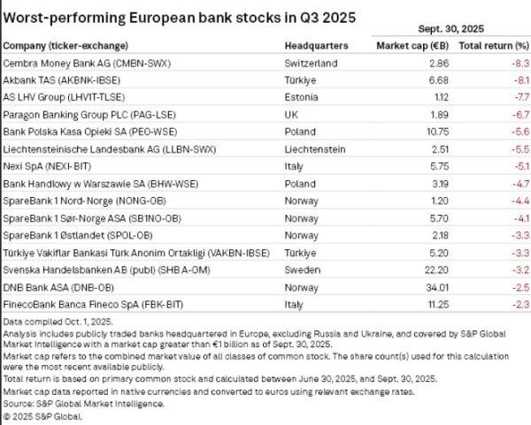 Στην ίδια κατηγορία αρνητικής απόδοσης βρέθηκαν οι τουρκικές Akbank TAS (-8,1%) και Türkiye Vakiflar Bankasi TAO (-3,3%). Ο δείκτης BIST Banks της Τουρκίας κατέρρευσε τον Σεπτέμβριο μετά από δικαστική απόφαση που αφορούσε τον ηγέτη του κύριου κόμματος της αντιπολίτευσης στην Κωνσταντινούπολη.