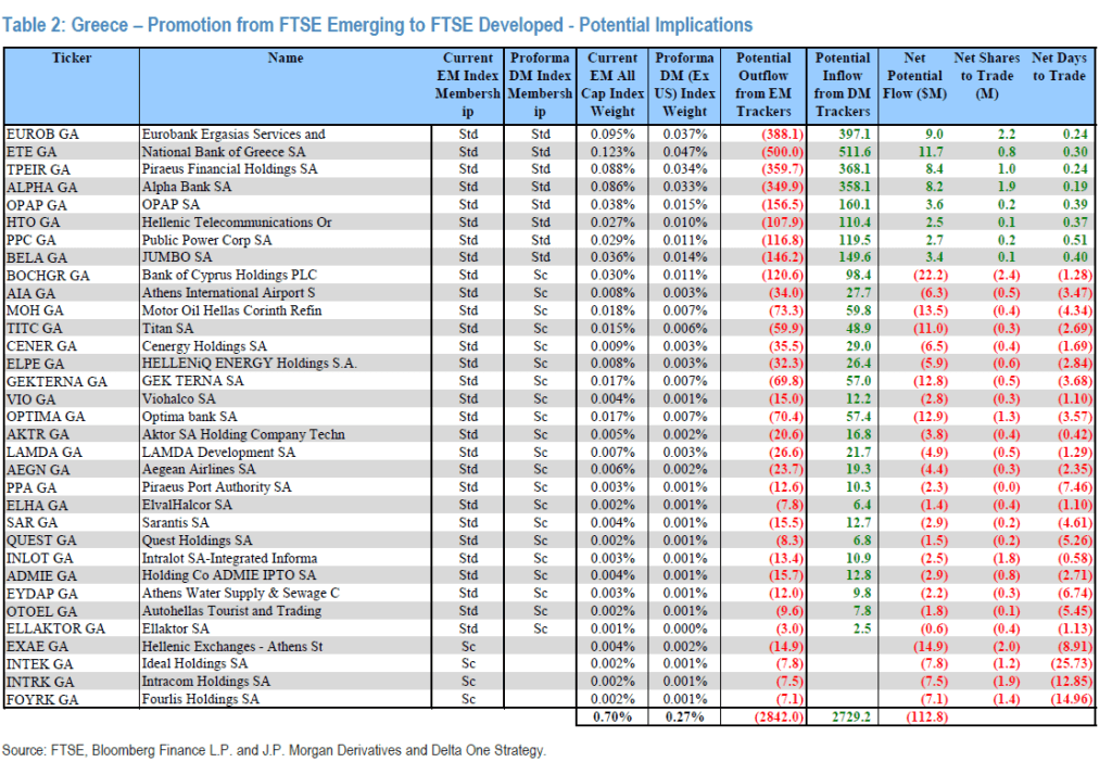 Το καθαρό αποτέλεσμα είναι μια εκτιμώμενη καθαρή εκροή 112,8 εκατ. δολ. για την ελληνική αγορά, σύμφωνα με τις προβλέψεις της JP Morgan.