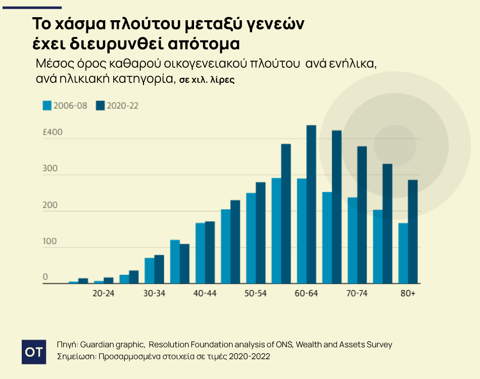 Το μέσο χάσμα πλούτου μεταξύ των ανθρώπων που βρίσκονται ηλικιακά στις αρχές της δεκαετίας των 30 και στις αρχές της δεκαετίας των 60 υπερδιπλασιάστηκε σε πραγματικούς όρους, από 135.000 λίρες το 2006-2008, σε 310.000 λίρες.