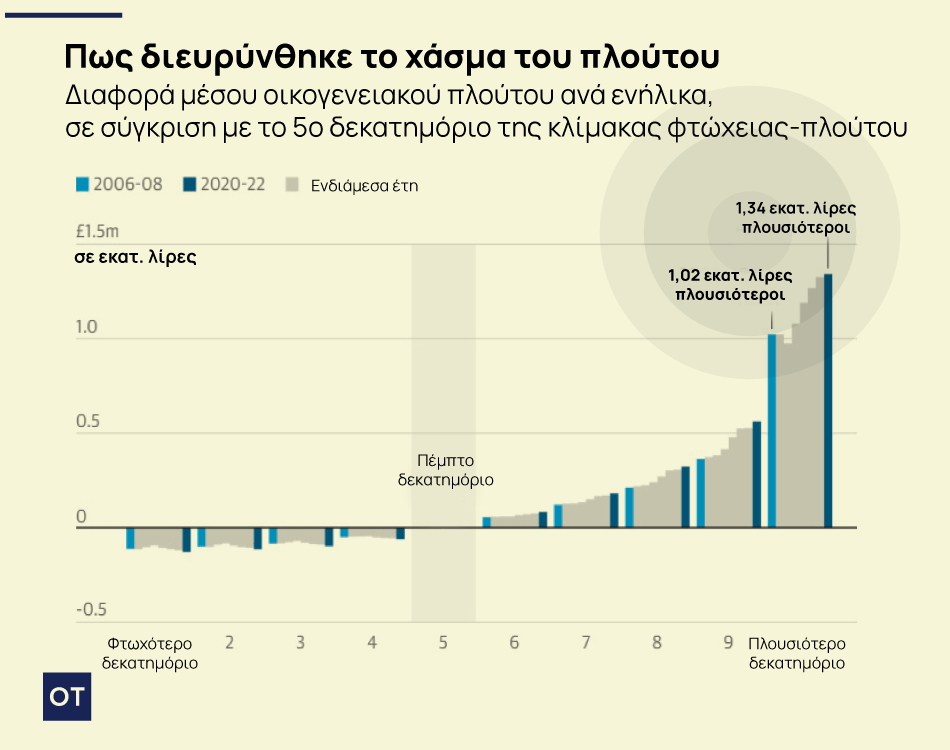 Το χάσμα μεταξύ του πλούτου του μέσου ατόμου και κάποιου που βρίσκεται στο κορυφαίο 10% ήταν 1 εκατομμύριο λίρες το 2006-2008, αλλά είχε διευρυνθεί σε 1,3 εκατομμύρια λίρες σε πραγματικούς όρους έως το 2020-2022, διαπιστώνει το ίδρυμα.