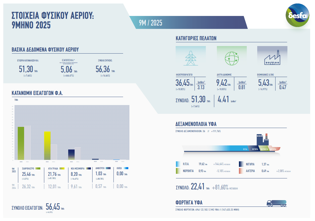 Τέλος, η υπηρεσία LNG Truck Loading του ΔΕΣΦΑ στον Τερματικό Σταθμό της Ρεβυθούσας κατέγραψε δυναμική ανάπτυξη, με τη φόρτωση 494 φορτηγών μεταφοράς LNG στο εννεάμηνο του 2025 έναντι 174 φορτηγών πέρυσι και την μεταφορά 148,05 GWh την ίδια χρονική περίοδο έναντι 51,28 GWh το 2024, καταγράφοντας τριπλασιασμό. Η δυναμική αύξηση των φορτίων επιβεβαιώνει ότι η υπηρεσία αναγνωρίζεται ως μια ευέλικτη και αποδοτική λύση για την κάλυψη ενεργειακών αναγκών απομακρυσμένων δικτύων διανομής και βιομηχανικών καταναλωτών στην Ελλάδα και την ευρύτερη περιοχή.