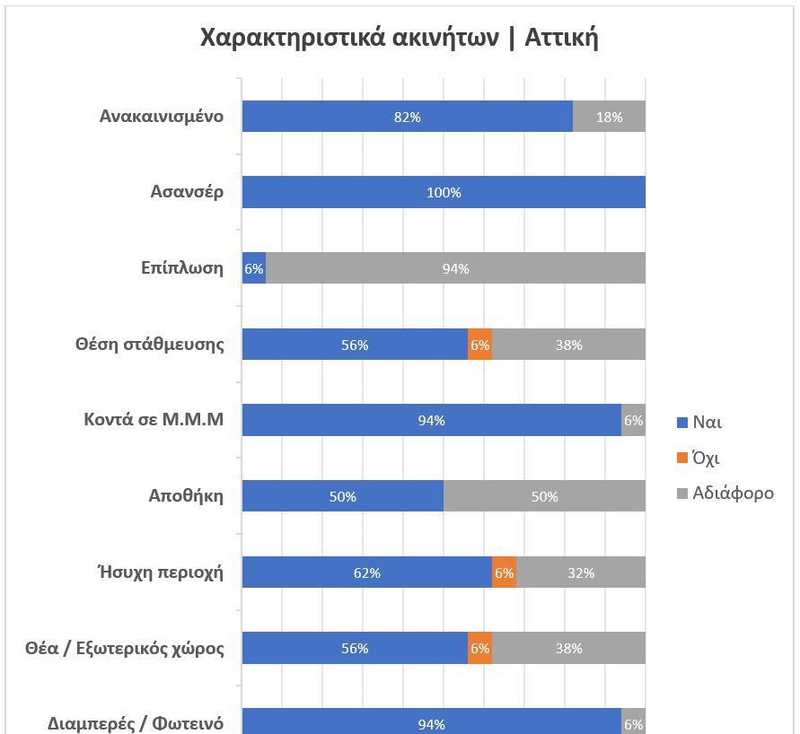 Στα χαρακτηριστικά των ακινήτων, οι περισσότεροι ενοικιαστές στην Αττική αναζητούν διαμερίσματα διαμπερή και φωτεινά σε ποσοστό 94%, σε ήσυχες περιοχές σε ποσοστό 62%, την ύπαρξη εξωτερικού χώρου ή θέας και χώρου στάθμευσης (56%).