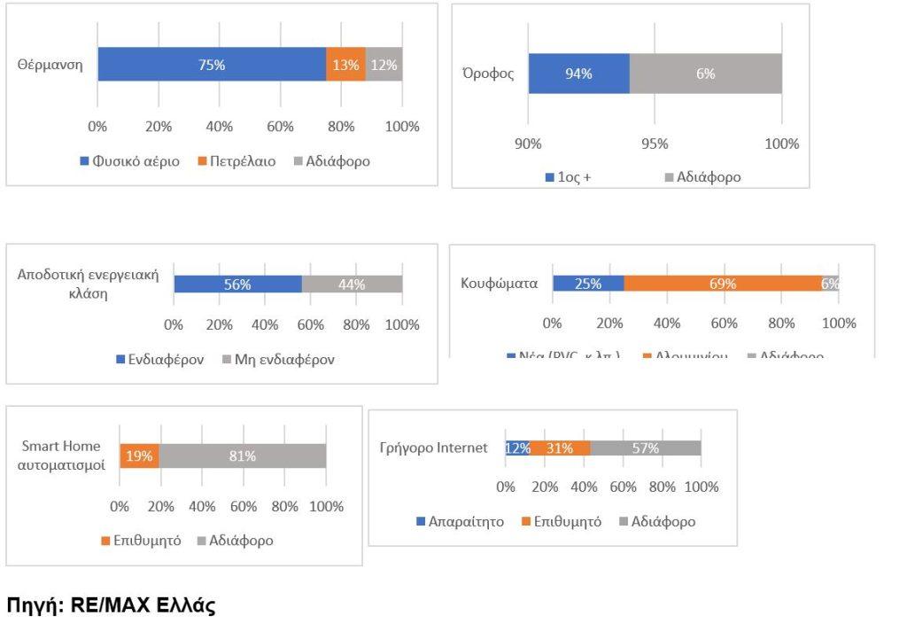 Για παροχές τεχνολογίας, οι περισσότεροι ενοικιαστές εμφανίζονται αδιάφοροι για τους λεγόμενους «έξυπνους» αυτοματισμούς, παρότι αυξάνεται η ζήτηση για ανακαινισμένα ακίνητα. Επίσης, η θέρμανση με φυσικό αέριο είναι κυρίαρχη σε Αττική και Θεσσαλονίκη, ενώ στην Περιφέρεια εξακολουθούν να χρησιμοποιούνται σε μεγάλο βαθμό το πετρέλαιο, αλλά και τα κλιματιστικά.
