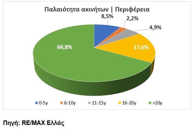 Η παλαιότητα των ακινήτων στην Περιφέρεια είναι γενικά μικρότερη σε σύγκριση με την Αττική και τη Θεσσαλονίκη. Παρότι το 66,8% των μισθώσεων αφορά κατοικίες άνω των 20 ετών, υπάρχει και ένα σημαντικό ποσοστό νεότερων ακινήτων. Συγκεκριμένα, το 17,6% των μισθώσεων αφορά κατοικίες ηλικίας 16 έως 20 ετών, ενώ ένα επιπλέον 15,6% αφορά ακίνητα έως 15 ετών.