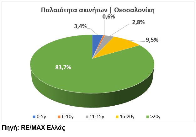 Σχετικά με την ηλικία, παλαιότερα ακίνητα παραμένουν κυρίαρχα και στη Θεσσαλονίκη, καθώς το 83,7% των μισθώσεων αφορά ακίνητα άνω των 20 ετών. Τα νεόδμητα ακίνητα αφορούν μόλις το 3,4% των ενοικιάσεων, ποσοστό μικρότερο από το αντίστοιχο της Αττικής.