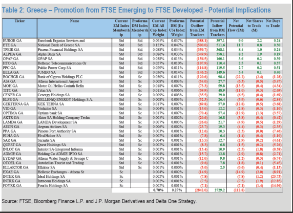 Στο ίδιο μήκος και η JP Morgan, η οποία θεωρεί ότι η ανακατάταξη της ελληνικής αγοράς θα επιφέρει σημαντικές εκροές ύψους 2,84 δισ. δολ. από παθητικά επενδυτικά κεφάλαια που παρακολουθούν τον δείκτη FTSE Emerging Markets.