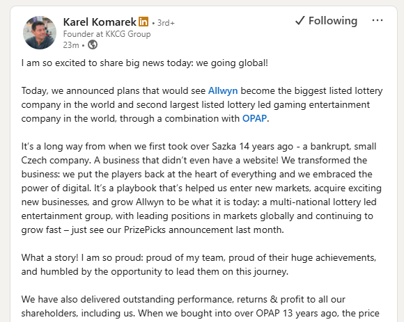 «Είμαι τόσο ενθουσιασμένος που μοιράζομαι σήμερα μεγάλα νέα: γινόμαστε παγκόσμιοι!» με αυτή την ανάρτηση στον προσωπικό του λογαριασμό στο Linkedin, ο ιδρυτής και πρόεδρος της Allwyn και της KKCG Group AG Κάρελ Κόμαρεκ, σχολιάζει με διθυράμβους τη συμφωνίας συγχώνευσης με τον ΟΠΑΠ.