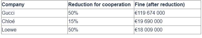 Συγκεκριμένα, οι Gucci και Loewe συνεργάστηκαν με την Επιτροπή παρέχοντας αποδεικτικά στοιχεία με σημαντική προστιθέμενη αξία σε πρώιμο στάδιο της έρευνας. Η συνεργασία της Gucci περιελάμβανε την αποκάλυψη μιας παράβασης των κανόνων ανταγωνισμού της ΕΕ που δεν ήταν ακόμη γνωστή στην Επιτροπή, ενώ η συνεργασία της Loewe επέτρεψε στην Επιτροπή να επεκτείνει το χρονικό πεδίο εφαρμογής της εν λόγω παράβασης.