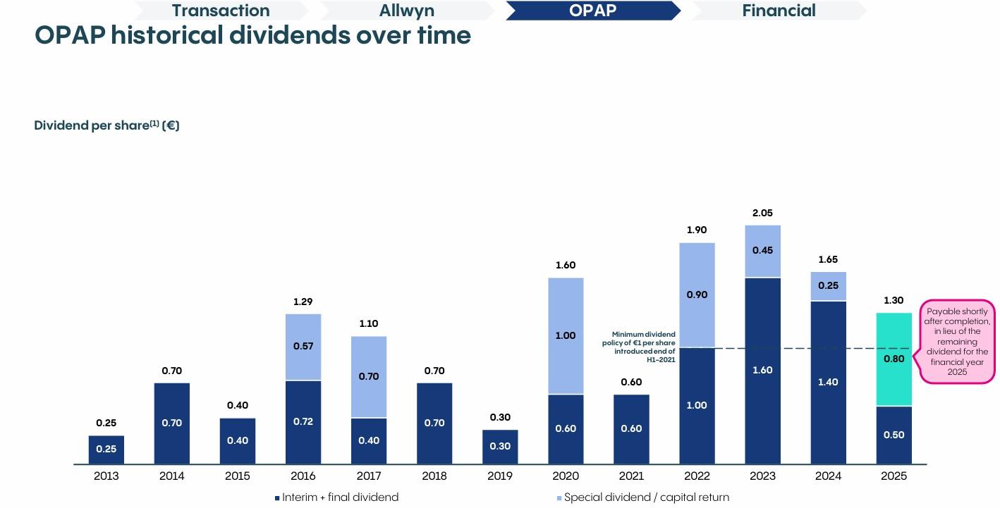 Σε ό,τι αφορά τις πληρωμές προς τους μετόχους, πέρα από το προγραμματισμένο ενδιάμεσο μέρισμα €0,50 που θα καταβληθεί τον Νοέμβριο, η νέα εταιρεία θα καταβάλει ειδικό μέρισμα €0,80 το επόμενο έτος και έχει δεσμευτεί να καταβάλει τουλάχιστον €1,00 ανά μετοχή στο μέλλον.