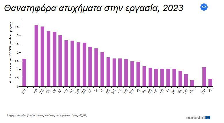 Σε ολόκληρη την ΕΕ, καταγράφηκαν κατά μέσο όρο 1,63 θάνατοι ανά 100.000 εργαζόμενους το 2023, σε σύγκριση με 1,66 θανάτους το 2022. Το ποσοστό επίπτωσης παρέμεινε κάτω από 2 θανάτους ανά 100.000 εργαζόμενους από το 2016.