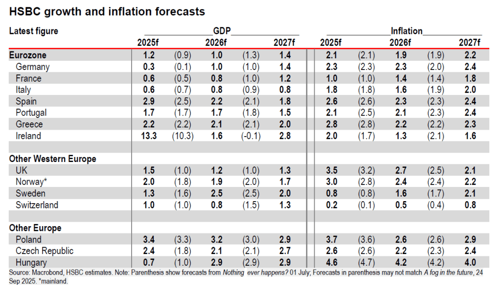 Παρά την προβλεπόμενη ελαφρά πτώση του πληθωρισμού κάτω από τον στόχο για το μεγαλύτερο μέρος του επόμενου έτους, οι αναλυτές της HSBC εκτιμούν ότι ο πληθωρισμός ενδέχεται να παραμείνει υπό πίεση το 2026 λόγω της ενίσχυσης του ευρώ, των αμερικανικών δασμών ή πιθανών αλλαγών στις εμπορικές ροές από την Κίνα.
