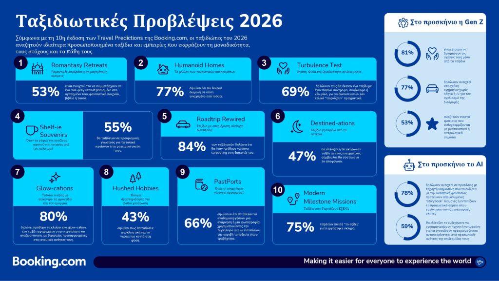 Οι ταξιδιώτες του 2026 αναζητούν ιδιαίτερα προσωποποιημένα ταξίδια και εμπειρίες που εκφράζουν τη μοναδικότητα, τους στόχους και τα πάθη τους, αναφέρει η Booking.com στη 10η έκδοση των Travel Predictions.