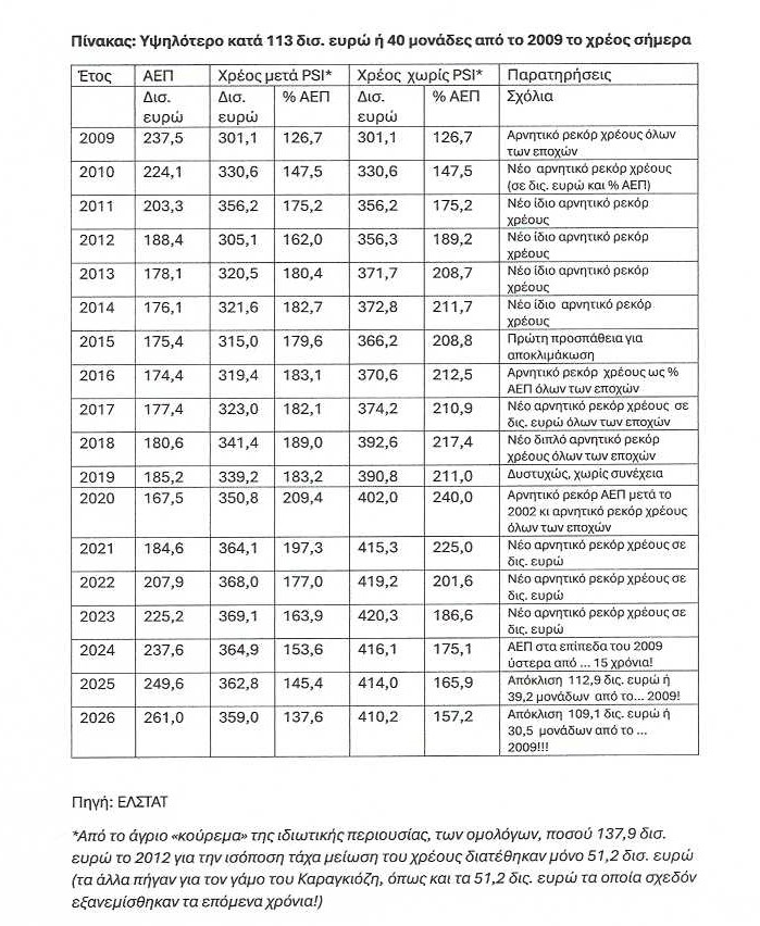 Και λαμβάνεται αυθαίρετα, διότι το 2010, που είναι το πρώτο έτος εφαρμογής του πρώτου μνημονίου, μόλις σε ένα εξάμηνο κατερρίφθησαν τα αρνητικά ρεκόρ όλων των εποχών (τουλάχιστον μετά το 1960), όπως, για παράδειγμα, και του χρέους, τόσο σε δις. ευρώ όσο και ως ποσοστό του ΑΕΠ (βλέπε παρατιθέμενο πίνακα). Δηλαδή, σε σχέση με το χρέος 2009, το οποίο ήταν αφορμή να παραδοθεί η χώρα στη γαμψόνυχη τρόικα, σε λιγότερο από ένα έτος (σε οκτώ μήνες) το χρέος αυξήθηκε πάνω από … 30 δις. ευρώ ή πάνω από 20 ποσοστιαίες μονάδες! Με αυτό το χρέος του εφιαλτικού 2010 και των επόμενων οκτώ ετών της εποπτείας, συγκρίνει το υπουργείο Εθνικής Οικονομίας και Οικονομικών το προβλεπόμενο για το 2026 χρέος των 359 δις. ευρώ (που είναι πάλι υψηλότερο από το εφιαλτικό εκείνο του 2010!) ή του 137,6% του ΑΕΠ (που το πραγματικό το 2025 είναι υψηλότερο κατά 39,2 μονάδες και το 2026 υψηλότερο κατά 30,5 μονάδες από αντίστοιχο του … 2009!