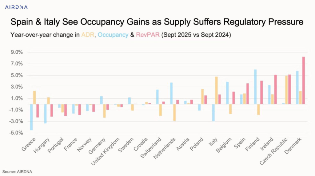 Across Europe, short-term rentals maintained steady growth in Sept. after a record summer. Listings rose 2.3% year-on-year to nearly 4 million, while demand grew 3.6%, totaling about 46 million overnight stays. As new regulations tighten and supply growth slows, higher occupancy rates are emerging—especially in Spain and Italy, where reduced listings have pushed RevPAR up by 4% and 2%, respectively.